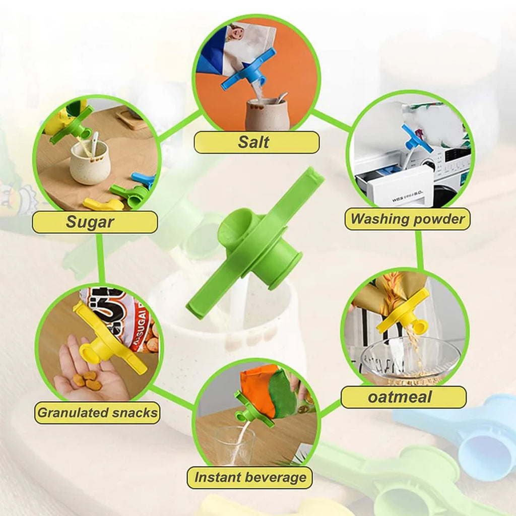 Packet Pourer & Sealer Clip with Spout – Reusable Snap-Lock Dispenser Cap for Grocery Pouches (Oil / Atta / Sugar / Rice / Snacks) | Fits Most Plastic Bags | Pack of 4